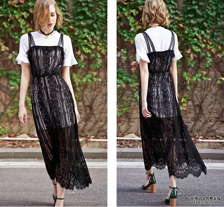 3.chic两件套连衣裙蕾丝镂空裙子夏T恤吊带套装裙